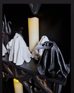 “A hand-crafted clay ghost crowned with the skeletal visage of a crow, merging death and spirit into one haunting form. Each detail is sculpted with care, evoking an omen of mystery and the macabre.”